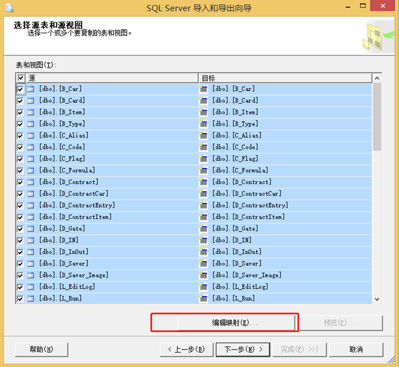 2、選擇表和源視圖--編輯映射--刪除現(xiàn)有目標表中的行、啟用標識插入--打上對勾--確定。