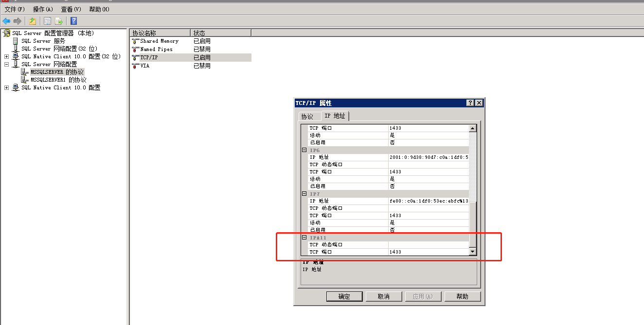 5、“IPALL”的所有端口改成“1433”若存在多個(gè)實(shí)例則可以修改對(duì)應(yīng)的端口為1533等,與步驟4中設(shè)置的端口保持一致。