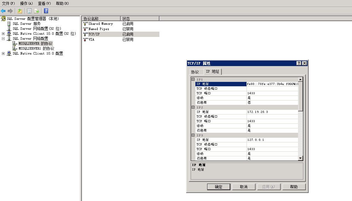 4、在跳出來的對(duì)話框,里面有好多TCP/IP的端口,找到“IP3”,更改IP地址 為自己電腦的IP地址(或者是127.0.0.1) 在TCP端口添加1433,然后選擇啟動(dòng),若存在多個(gè)實(shí)例,則可以修改對(duì)應(yīng)的端口為1533等,與原來的實(shí)例端口不一致。